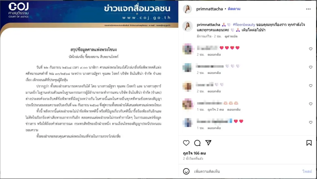 โพสต์ดังกล่าวหลังที่ พริม และ อมม ได้ไกล่เกลี่ยเป็นที่ราบรื่น ทั้งสองฝ่ายตกลง ถอนฟ้องทุกคดี และยุติปัญหาที่เกิดขึ้นอย่างเป็นมิตร