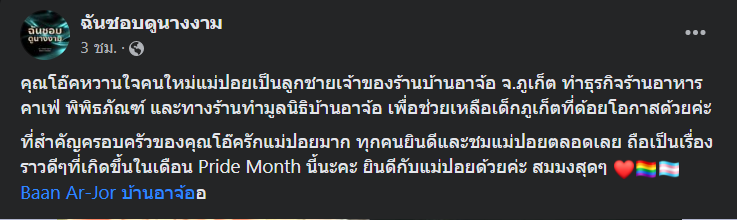 “คุณโอ๊ค หวานใจคนใหม่แม่ปอย เป็นลูกชายเจ้าของร้านบ้านอาจ้อ จ.ภูเก็ต ทำธุรกิจร้านอาหาร คาเฟ่ พิพิธภัณฑ์ และทางร้านทำมูลนิธิบ้านอาจ้อ เพื่อช่วยเหลือเด็กภูเก็ตที่ด้อยโอกาส ที่สำคัญครอบครัวของคุณโอ๊ครักแม่ปอยมาก ทุกคนยินดีและชมแม่ปอยตลอดเลย ถือเป็นเรื่องราวดี ๆ ที่เกิดขึ้นในเดือน Pride Month นี้”