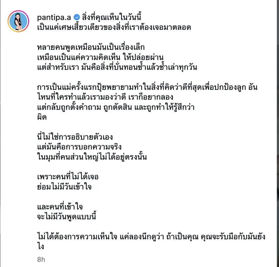 โดยปุ้มปุ้ยได้แคปภาพคอมเมนต์ดังกล่าวมาโพสต์ พร้อมระบายความรู้สึกผ่านแคปชั่นยาว ที่สะท้อนมุมของหัวอกคนเป็นแม่อย่างชัดเจน ระบุว่า