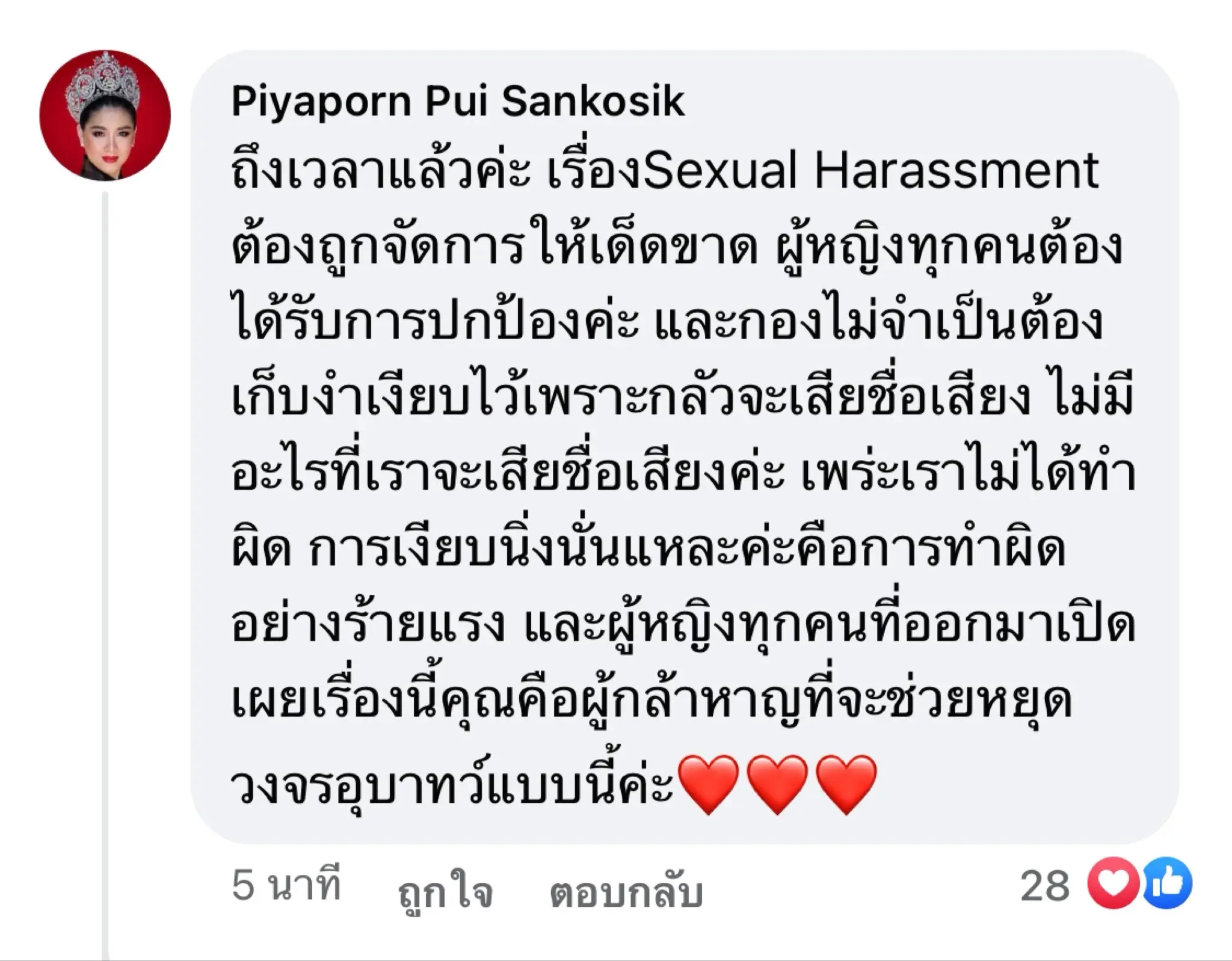 ล่าสุด ปุ้ย TPN ผู้ถือลิขสิทธ์มิสยูนิเวิร์สไทยแลนด์ก็ได้ออกเคลื่อนไหวผ่านเฟซบุ๊ก แม้เจ้าตัวจะเดินทางไปทำหน้าที่อับแอนชิลี ที่ประเทศอิสราเอล แต่ก็ยังติดตามเรื่องนี้อย่างใกล้ชิด โดยแม่ปุ้ยได้โพสต์ว่า ถึงเวลาแล้วค่ะ เรื่องSexual Harassment