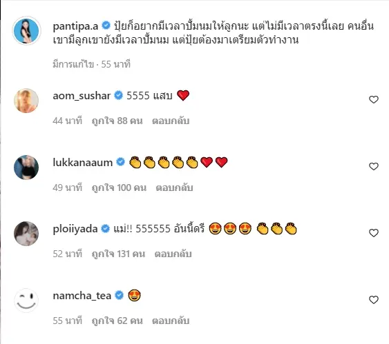 โดยทางฝั่งของปุ้มปุ้ยเอง ก็ตั้งแคปชั่นว่า “ปุ้ยก็อยากมีเวลาปั๊มนมให้ลูกนะ แต่ไม่มีเวลาตรงนี้เลย คนอื่นเขามีลูกเขายังมีเวลาปั๊มนม แต่ปุ้ยต้องมาเตรียมตัวทำงาน” ทำเอางานนี้ได้เสียงฮือฮาไปจากคนที่ติดตามเป็นจำนวน