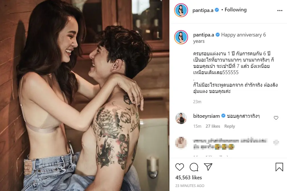 ล่าสุด สาวปุ้มปุ้ยได้โพสต์รูปย้อนความสวีทกับรูปพรีเวดดิ้งสุดเผ็ดของเธอกับหนุ่มกวิน แต่งานนี้ถ้าให้มาแบบหวานๆ ก็คงไม่ใช่ปุ้มปุ้ย เพราะงานนี้เธอมาพร้อมกับแคปชั่นสุดฮาว่า “Happy anniversary 6 year ครบรอบแต่งงาน 1 ปี กับการคบกัน 6 ปี เป็นอะไรที่ยาวนานมากๆ นานมากจริงๆ ก็ขอบคุณน้า จะเข้าปีที่ 7 แล้ว ยังเหนื่อยเหมือนเดิมเลย555555 ก็ไม่มีอะไรจะพูดนอกจาก ถ้ารักจริง ต้องลิงอุ้มแตง ขอบคุณค่ะ”