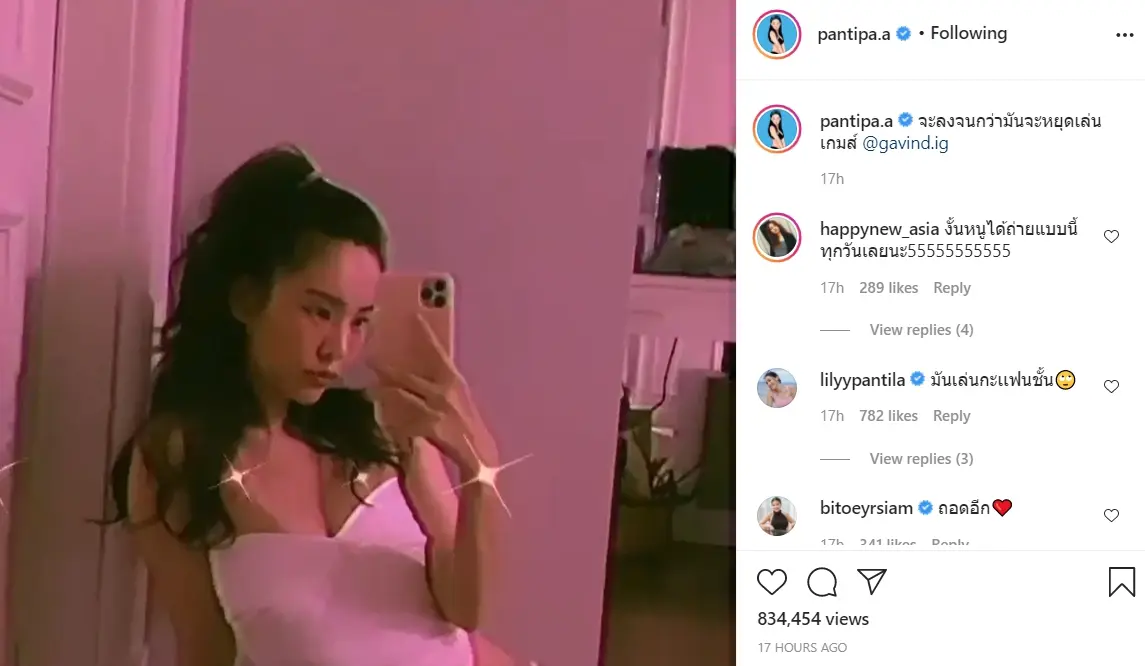 โดยล่าสุด สาวปุ้มปุ้ยได้ลงคลิปในไอจีส่วนตัวของตน โชว์ความเซ็กซี่สุดๆ จนทำเอาไอจีแทบจะลุกเป็นไฟ แต่พอเลื่อนไปอ่านแคปชั่นเท่านั้นก็ต้องหลุดขำออกมา โดยเธอเขียนไว้ว่า “จะลงจนกว่ามันจะหยุดเล่นเกมส์ @gavind.ig” พร้อมกับแท็กไอจีไปหาคุณสามี