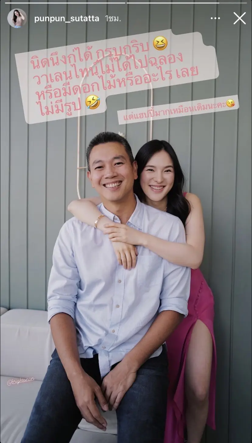ล่าสุด ด้านสตอรี่ทางอินสตาแกรมของนักแสดงสาวสวย ปันปัน สุทัตตา ได้มีการโพสต์ภาพคู่หวานใจ พร้อมข้อความว่า “นิดนึงก็ได้ กรุบกริบ วาเลนไทน์ไม่ได้ไปฉลองหรือมีดอกไม้ หรืออะไรเลย ไม่มีรูป แต่แฮปปี้มากเหมือนเดิมนะคะ”