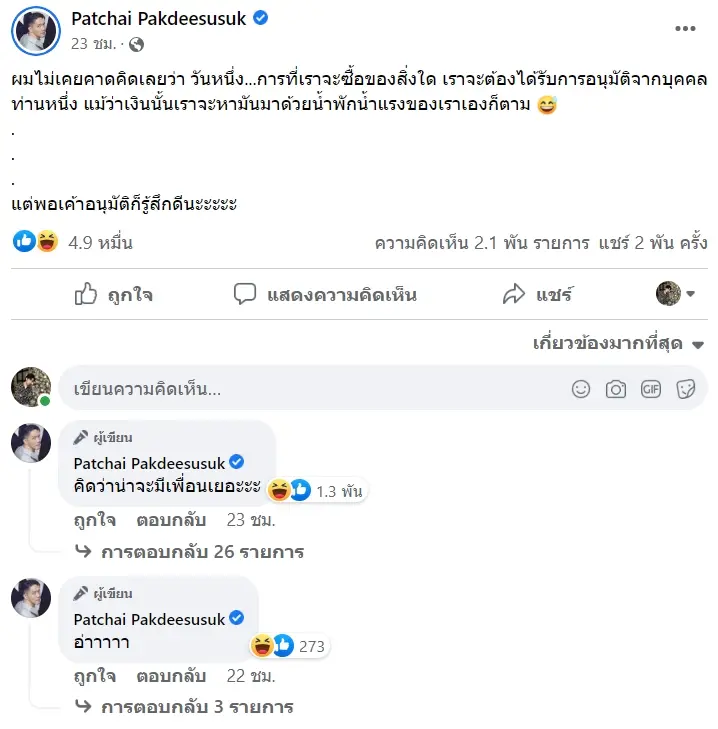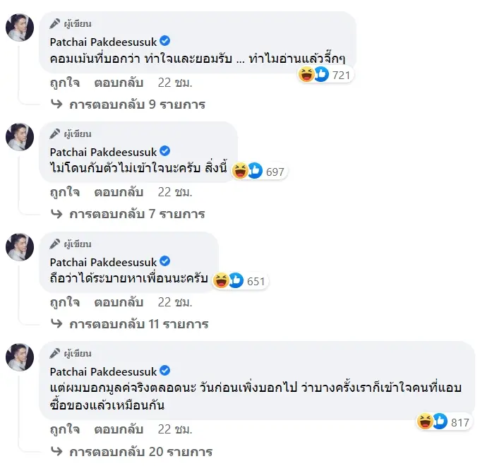 เท่านี้ยังไม่พอ เจ้าตัวยังเข้ามาคอมเมนต์ในโพสต์ดังกล่าวเพิ่มอีกว่า คิดว่าน่าจะมีเพื่อนเยอะะะ ,คอมเม้นที่บอกว่า ทำใจและยอมรับ … ทำไมอ่านแล้วจึ๊กๆ ,ไม่โดนกับตัวไม่เข้าใจนะครับ สิ่งนี้ ,ถือว่าได้ระบายหาเพื่อนนะครับ ,แต่ผมบอกมูลค่จริงตลอดนะ วันก่อนเพิ่งบอกไป ว่าบางครั้งเราก็เข้าใจคนที่แอบซื้อของแล้วเหมือนกัน