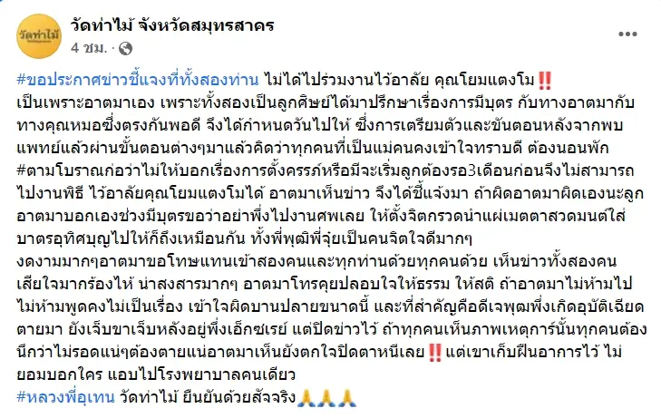 เจ้าอาวาสวัดดัง ‘วัดท่าไม้’ ออกชี้แจงผ่านเฟซบุ๊ก ต่อกรณีของ ดีเจพุฒ และ จุ๋ย วรัทยา ที่ไม่ได้ร่วมงานพิธีไว้อาลัยของ ‘แตงโม นิดา’ เป็นความเชื่อโบราณ ห้ามบอกใครก่อน 3 เดือน