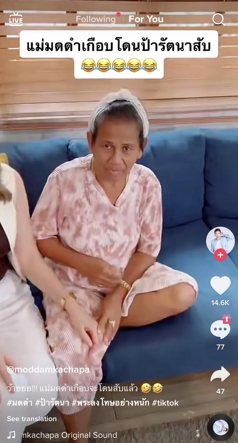 ล่าสุด มดดำ คชาภา พิธีกรฝีปากกล้า ได้มีการโพสต์คลิปลงใน TikTok ซึ่งภายในคลิป มดดำ ได้มีการพูดว่า อะไรนะ ป้ารัตนา ทำเอา ป้ารัตนา ตอบกลับทันทีว่า มึงอย่ามาถ่ายทำกูนะ พร้อมกับลุกขึ้นมาทาง มดดำ แต่โชคดีที่มี โอ๋ ภัคจีรา รั้งแขน ป้ารัตนา ไว้ได้