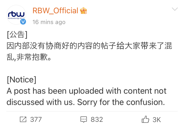 ก่อนหน้านี้ RBW Entertainment ได้โพสต์เกี่ยวกับจุดยืนทางการเมืองของจีนทั้งทางอินสตาแกรมและเวยป๋อ (Weibo)