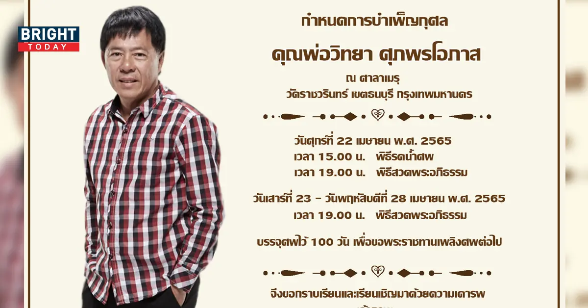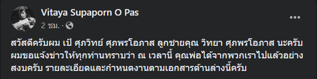 ‘สวัสดีครับผม เป้ ศุภวิทย์ ศุภพรโอภาส ลูกชายคุณ วิทยา ศุภพรโอภาส นะครับ ผมขอแจ้งข่าวให้ทุกท่านทราบว่า ณ เวลานี้ คุณพ่อได้จากพวกเราไปแล้วอย่างสงบครับ รายละเอียดและกำหนดงานตามเอกสารด้านล่างนี้ครับ’
