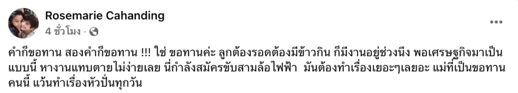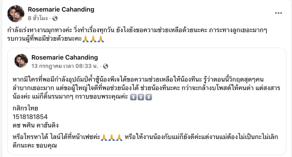 โดยโรสแมรี่ระบุว่า กว่าจะตัดสินใจโพสต์ขอความช่วยเหลือ ต้องทำใจอยู่นาน เพราะไม่อยากให้คนเข้าใจผิดหรือมองแง่ลบ แต่สถานการณ์ตอนนี้ยากลำบากเกินรับไหว พร้อมแนบเบอร์บัญชี เผื่อมีผู้ใหญ่ใจดีที่พอมีกำลังจะช่วยอุปถัมภ์ลูกชายได้
