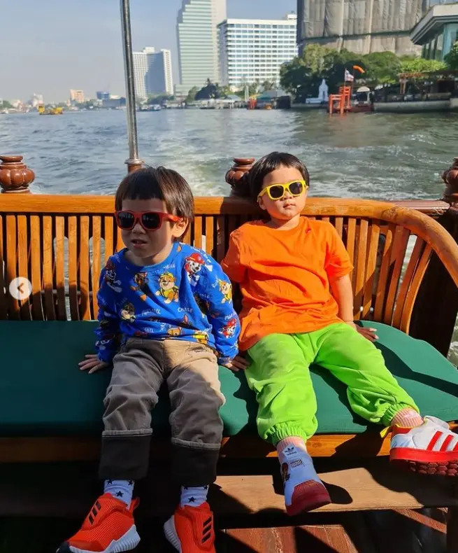 โดยล่าสุด แม่ชมก็ได้พาสองหนุ่มสองมุมไปล่องเรือที่แม่น้ำเจ้าพระยา โดยไม่ลืมให้ทั้งน้องสายฟ้าและน้องพายุใส่แว่นกันแดดเพื่อป้องกันดวงตาด้วย แต่ดูเหมือนว่าน้องพายุจะผิดพลาดทางเทคนิคนิดหน่อย เลยใส่แว่นกลับหัวในทีแรก ก่อนจะพลิกกลับมาเองจนแม่ชมถึงกับลั่นว่า ‘เออ รู้เหมือนกันนี่’