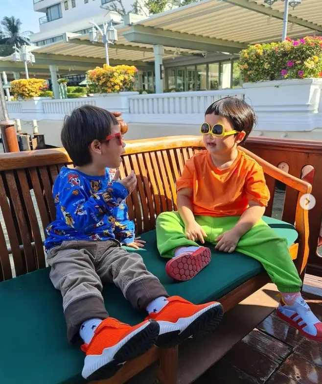 สายฟ้า-พายุ ขึ้นชื่อว่าเป็นสองทายาทของแฟชั่นนิสต้าตัวแม่อย่างสาว ชมพู่ อารยาแล้วนั้น เสื้อที่ใส่บอกเลยว่าไม่มีวันหลง เพราะสีจี๊ดจ๊าดนีออนสะท้อนแดดแบบสุด ๆ