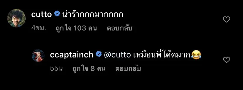 แต่ที่ทำเอาแฟนๆต้องโฟกัสก็คือ คัตโตะ ได้มีการเข้ามาคอมเมนต์ว่า “น่ารักมากกก” หนุ่มกัปตันจึงตอบไปว่า “เหมือนพี่โค้ดมาก” ซึ่งพี่โค้ดที่ว่าเนี่ยก็คือ โค้ดดี้ เสือร้องไห้ น้องชายของคัตโตะนั่นเอง งานนี้บอกเลยว่าหนุ่มกัปตันไม่ได้คิดคนเดียวแน่ๆ เพราะเหมือนมากจริงๆ อย่างกับพี่โค้ดย่อส่วน 55555
