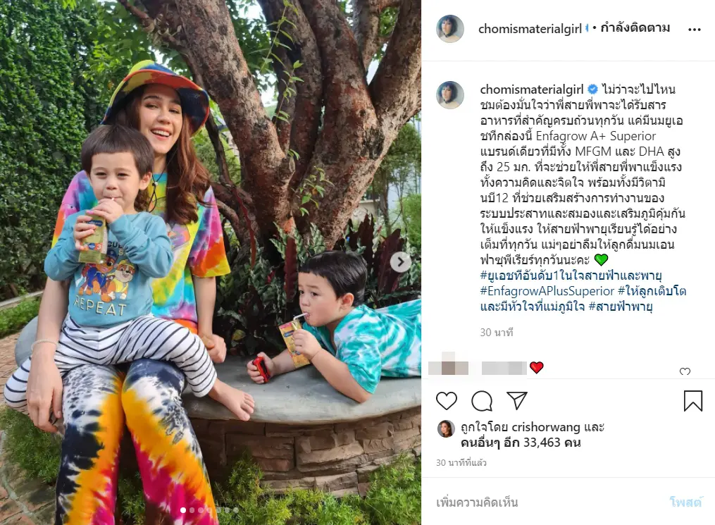 โดยล่าสุด สาวชมพู่ก็ได้โพสต์ทั้งภาพนิ่งและคลิปเพื่อโฆษณา Enfagrow A+ Superior ซึ่งสายฟ้าได้ดื่มนม โพสต์ท่าอย่างสดใส ขณะที่พายุนั้นไม่ธรรมดา ถึงกับนอนดื่มเลยทีเดียว
