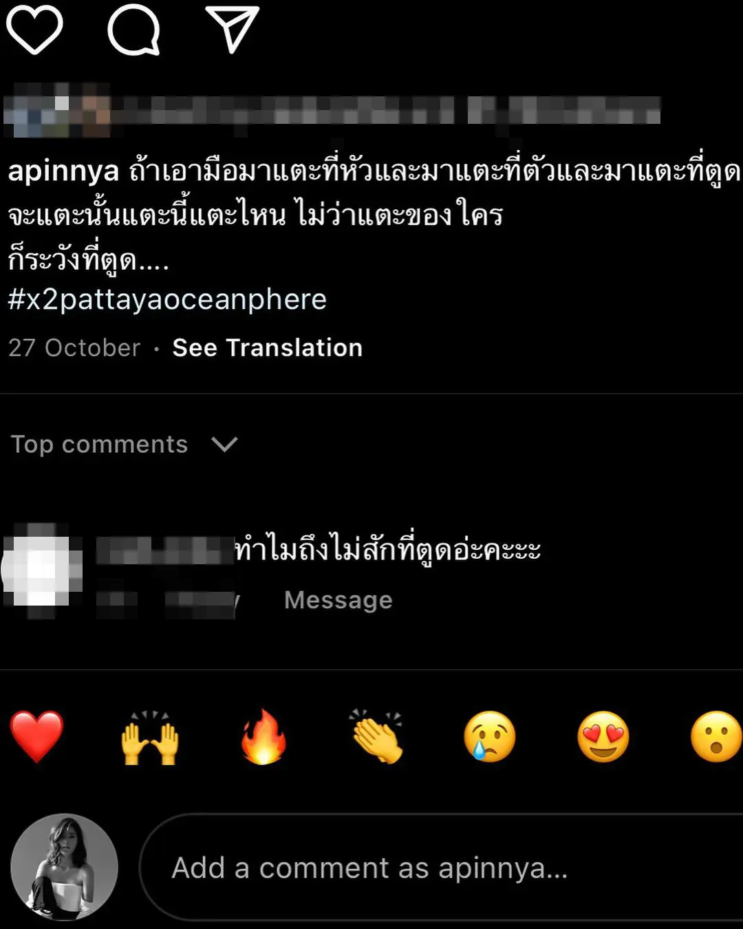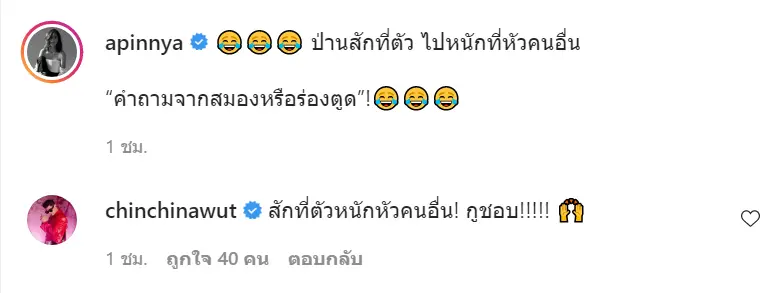 แต่ด้วยความเชิ่ดของ สายป่าน มีหรือจะกลัว งานนี้ขอแคปเอามาโพสต์ในไอจีของตัวเอง ถามกลับแคปชั่นที่ว่า “ป่านสักที่ตัว ไปหนักที่หัวคนอื่น“คำถามจากสมองหรือร่องตูX” ทำเอาทางด้านของ ชิน ชินวุฒิ ถึงกับเข้ามาคอมเมนต์ชอบใจกับแคปชั่นของ สายป่าน เลยทีเดียว