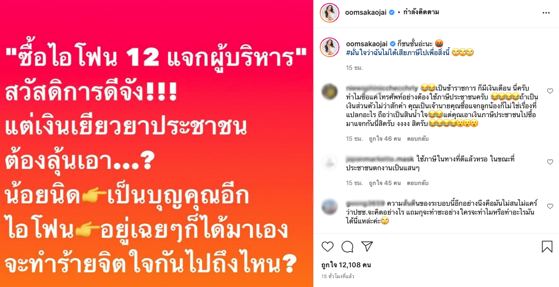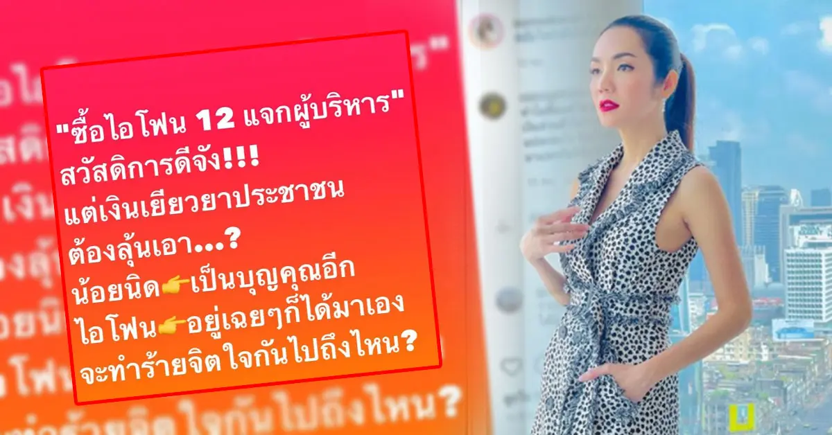 ล่าสุดเจ้าตัวออกมาฟาดเดือดอีกครั้งปมนายกทุ่มงล 2.6 ล้าน ซื้อไอโฟนแจกผู้บริหารโดยบอกว่า “ซื้อไอโฟน 12 แจกผู้บริหาร” สวัสดิการดีจัง!!! แต่เงินเยียวยาประชาชนต้องลุ้นเอา…? น้อยนิด – เป็นบุญคุณอีก ไอโฟน อยู่เฉยๆก็ได้มาเอง จะทำร้ายจิตใจกันไปถึงไหน? ทามกลางแฟนคลับที่เข้ามาคอมเมนต์วิจารณ์เป็นเสียงเดียวกัน