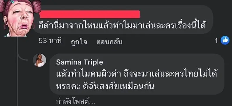 ล่าสุด ซามีน่า ได้มีโอกาสร่วมงาน กับ Gmm ในซีรีส์ เรื่อง สั่งใจให้หยุดรักเธอ โดยเธอได้มีการแคปข้อความจากชาวเน็ตที่คอมเมนต์ว่า อีดำนี่มาจากไหนแล้วทำไมมาเล่นละครเรื่องนี้ได้ ซึ่งเธอก็ไม่อยู่เฉย ได้มีการตอบกลับไปว่า แล้วทำไมคนผิวดำ ถึงจะมาเล่นละครไทยไม่ได้ หรอคะ ดิฉันสงสัยเหมือนกัน #คำถามคือทำไมคนผิวดำถึงจะมีพื้นที่ในสื่อบันเทิงไทยไม่ได้ งง ค่ะ แล้วนี่คือสิ่งที่เจอใน Episode ล่าสุด
