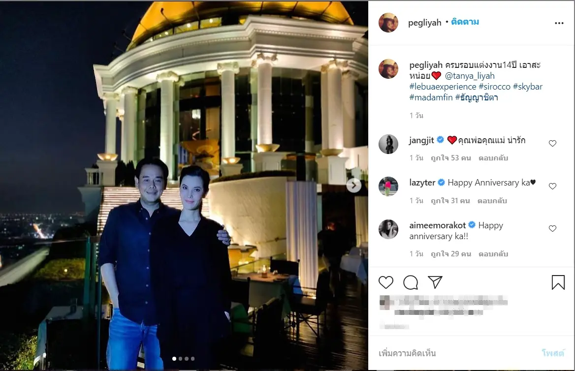 โดยล่าสุด ก็มีภาพหวานๆที่ฝ่ายชายได้ออกมาโพสต์ข้อความและรูปภาพผ่านอินสตาแกรม โดยเป็นวันครบรอบการแต่งงาน 14 ปีที่ทั้งคู่อยู่ด้วยกันมา แต่มาหักมุมตรงท้ายที่ว่า เป๊ก เข้ามาคอมเมนต์บนภาพไอจีตนเองพร้อมกับบอกว่า “ภรรยาไลน์มาด่าบอก 15 ปี ไม่ใช่ 14” บอกเลยว่าหักมุมสุดๆ