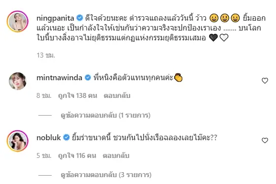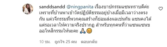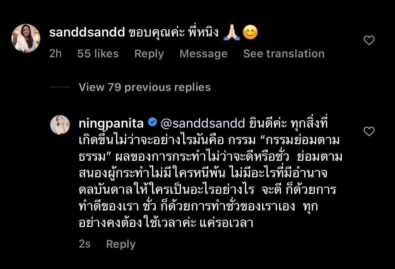 ที่มีการคอมเมนต์ขอบคุณหนิง ใต้โพสต์ในไอจีของหนิงเองด้วย ถึงหนิงเองก็มีการตอบโต้กลับไปยังคอมเมนต์ของแซนอย่างดุเดือดว่า