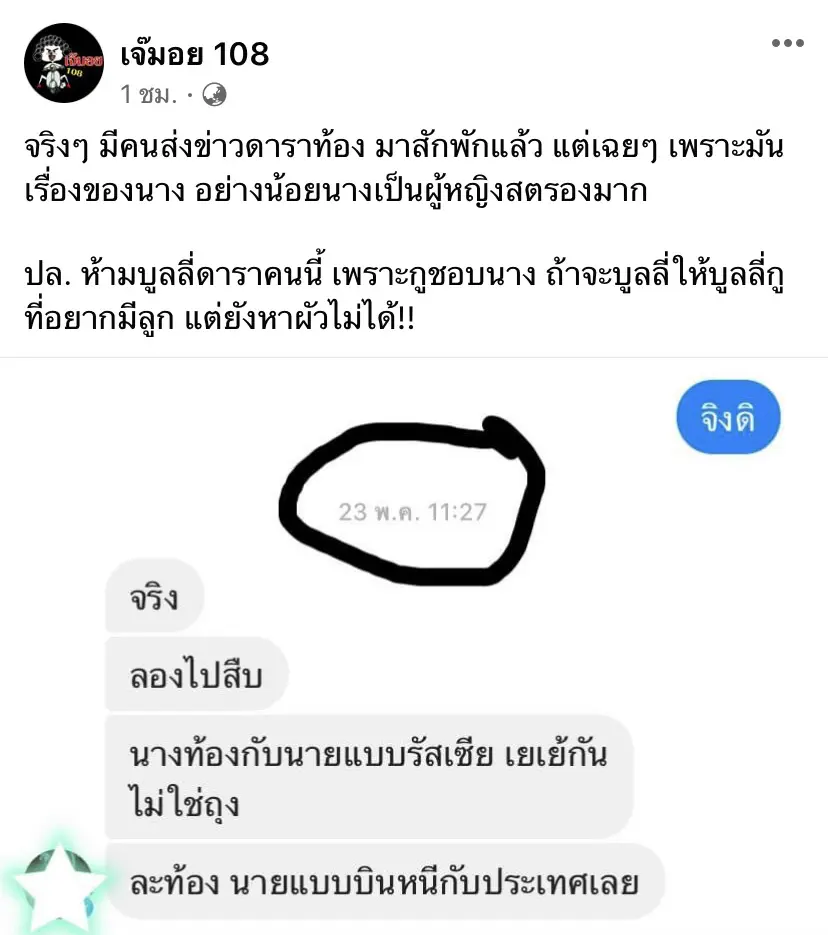 ส่วนทางด้านเพจดังอย่าง เจ๊มอย 108 เอง ก็ได้ออกมาโพสต์ภาพแชทที่เหมือนว่าพอจะรู้เรื่องนี้มานานแล้ว แต่ไม่ได้ออกมาเปิดเผยเรื่องราวใดๆ