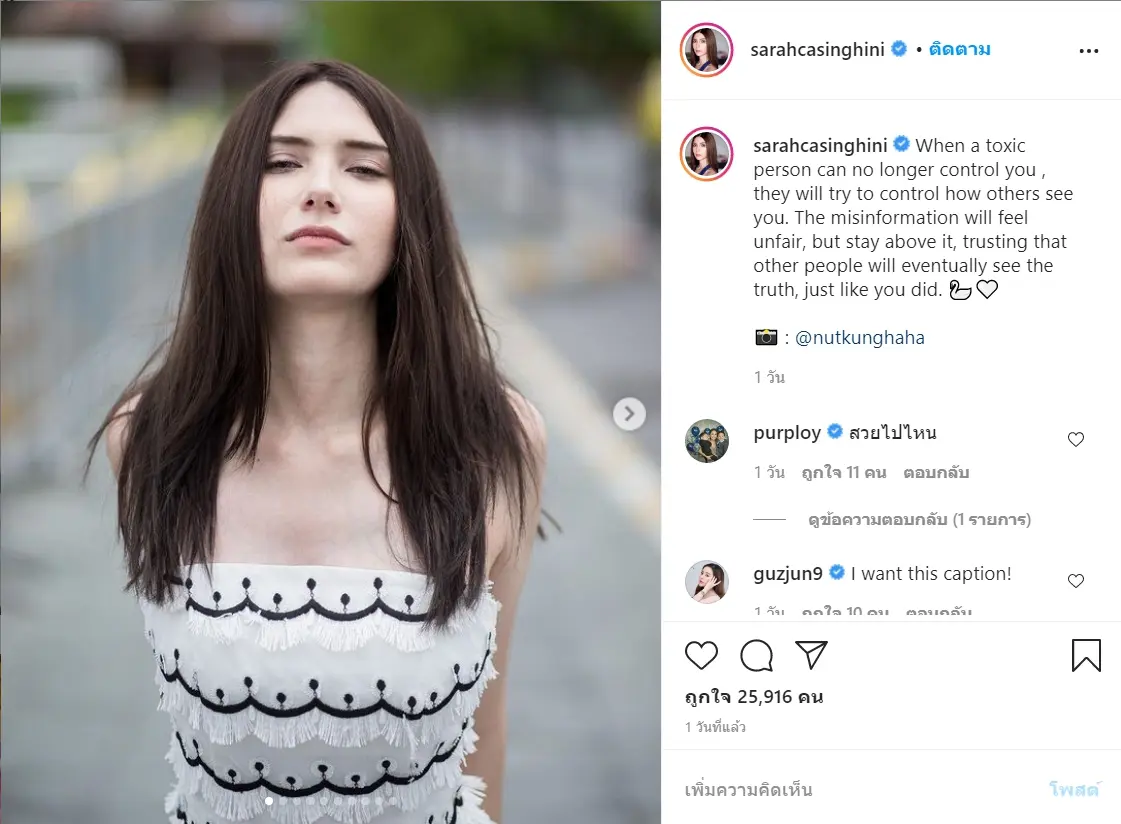 โดยล่าสุดซาร่า ได้โพสต์ข้อความระบุว่า “When a toxic person can no longer control you, they will try to control how others see you. The misinformation will feel unfair, but stay above it, trusting that other people will eventually see the truth, just like you did.”
