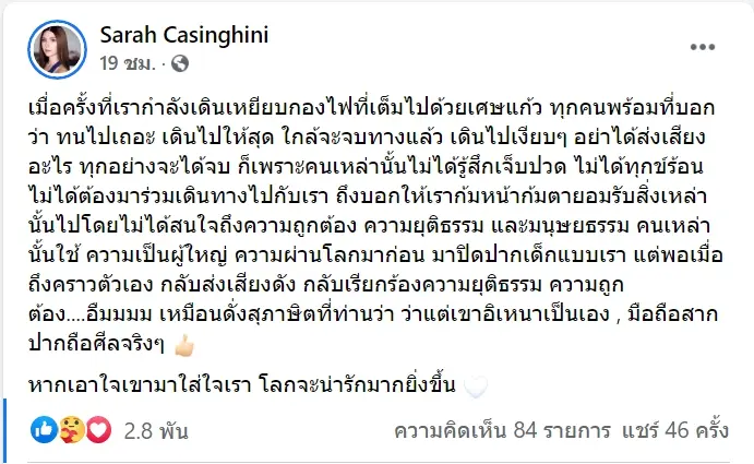 ไม่รู้ว่าใครกันนะที่ทำเอาคุณแม่ลูก 2 สุดแซ่บอย่าง ซาร่า คาซิงกินี นั้นกิดอาการหัวร้อนขึ้นมา จนทำให้ออกมาโพสต์ข้อความ ที่เรียกได้ว่าเหมือนเป็นการสื่อถึงใครบางคน ที่ทำตัวเป็นผู้ใหญ่ไม่น่าเคารพ นับถือ ซึ่งข้อความระบุว่า
