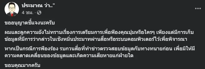 ล่าสุด ด้านทนายความฝั่งซาร่า ได้มีการโพสต์ผ่านเฟซบุ๊ก ประมาณ ว่า.. ด้วยข้อความว่า “ขออนุญาตชี้แจงนะครับ ผมและลูกความยังไม่ทราบเรื่องการเตรียมการเพื่อฟ้องคุณบุ๋มหรือใครๆ เพียงแต่มีการเก็บข้อมูลที่มีการว่ากล่าวในเชิงหมิ่นประมาทผ่านสื่อหรือระบบคอมพิวเตอร์ไว้เพื่อพิจารณาหากเป็นกรณีการฟ้องร้อง รบกวนสื่อที่ทำข่าวตรวจสอบข้อมูลกับทางทนายก่อน เพื่อมิให้มีความคลาดเคลื่อนของข้อมูลและเกิดความเสียหายแก่ฝ่ายใด ขอบคุณมากครับ”