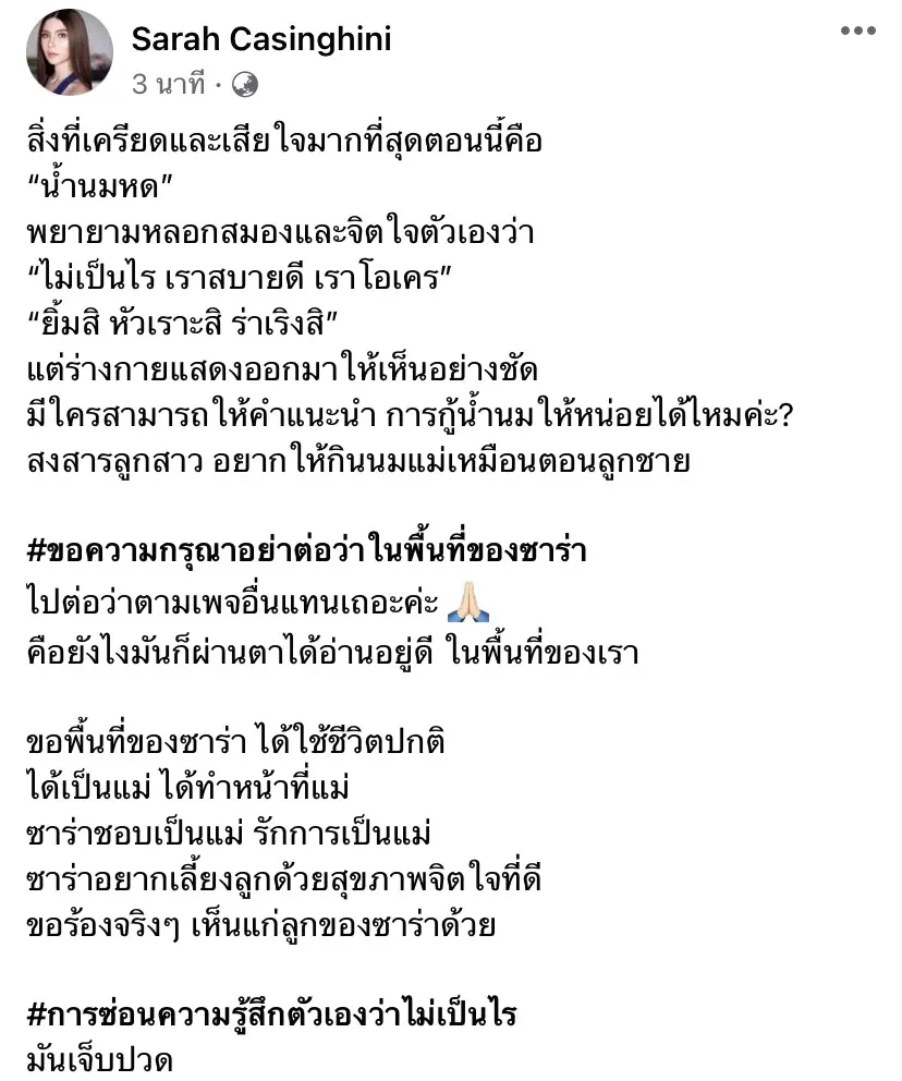 ซาร่าชอบเป็นแม่ รักการเป็นแม่ ซาร่าอยากเลี้ยงลูกด้วยสุขภาพจิตใจที่ดี ขอร้องจริงๆ เห็นแก่ลูกของซาร่าด้วย การซ่อนความรู้สึกตัวเองว่าไม่เป็นไร มันเจ็บปวด”
