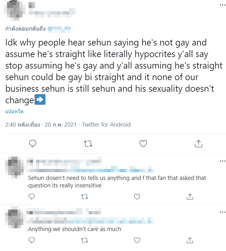 ดังกล่าว มีเหล่าเอ็กโซแอลที่ทวิตเกี่ยวกับคำถามที่ไม่เหมาะสม ว่ามันเป็นเรื่องส่วนตัว แม้เขาจะไม่ได้เป็นเกย์ก็ตาม รวมถึงมีคนแสดงความเห็นว่า ให้เลิกคิดว่าเขาเป็นเกย์หรือไม่ได้เป็นได้แล้ว เพราะปัจจุบันเพศมีความหลากหลายตามมิติของสังคม และเซฮุนจะเป็นอะไรก็ได้ ทั้งหมดเป็นเรื่องส่วนตัวและเซฮุนก็ยังเป็นเซฮุนอยู่ดี