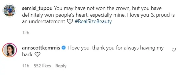 ทั้งนี้เธอก็ได้ออกมาเปิดใจผ่าน Instagram พร้อมกับระบุข้อความย่างภาคภูมิใจว่า รู้สึกเป็นเกียรติที่ได้เป็นตัวแทนของประเทศไทย และได้แสดงให้โลกเห็น #RealSizeBeauty ขอบคุณทุกคนที่สนับสนุน