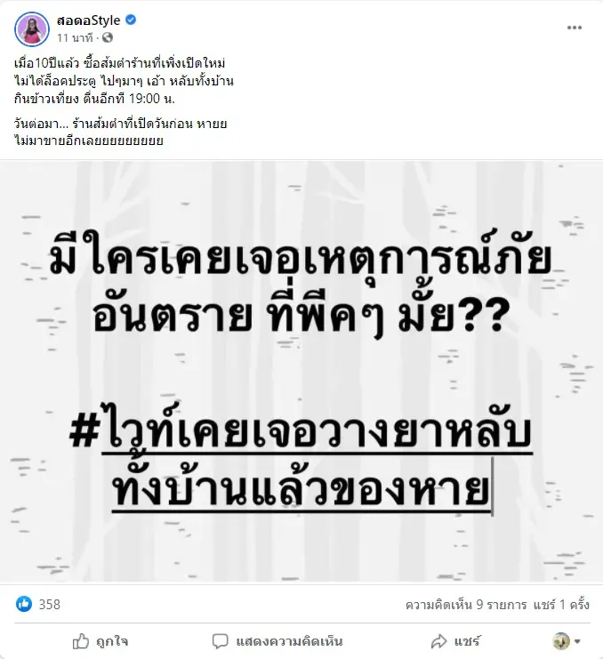 เส้นดาย สอดอStyle ออกมาโพสต์เฟซบุ๊กในเพจของตัวเอง ว่าใครเคยมีประสบการณ์อันตรายพีคๆในชีวิตมาบ้าง โดยสอดอเองก็ได้แชร์ประสบการณ์ของ ไวท์ แฟนหนุ่มของตัวเอง ว่าเคยโดนวางยาและของในบ้านหายไป จากร้านส้มตำที่มาเปิดใหม่