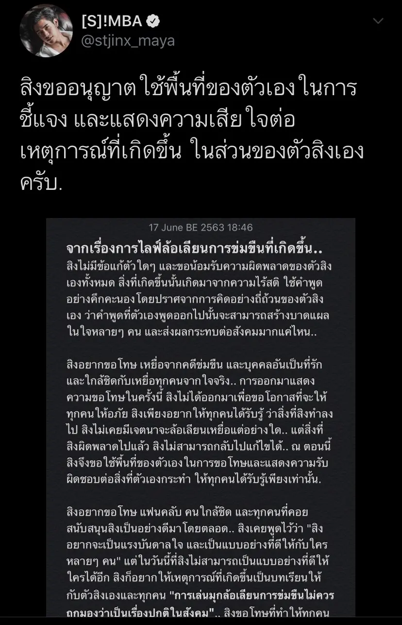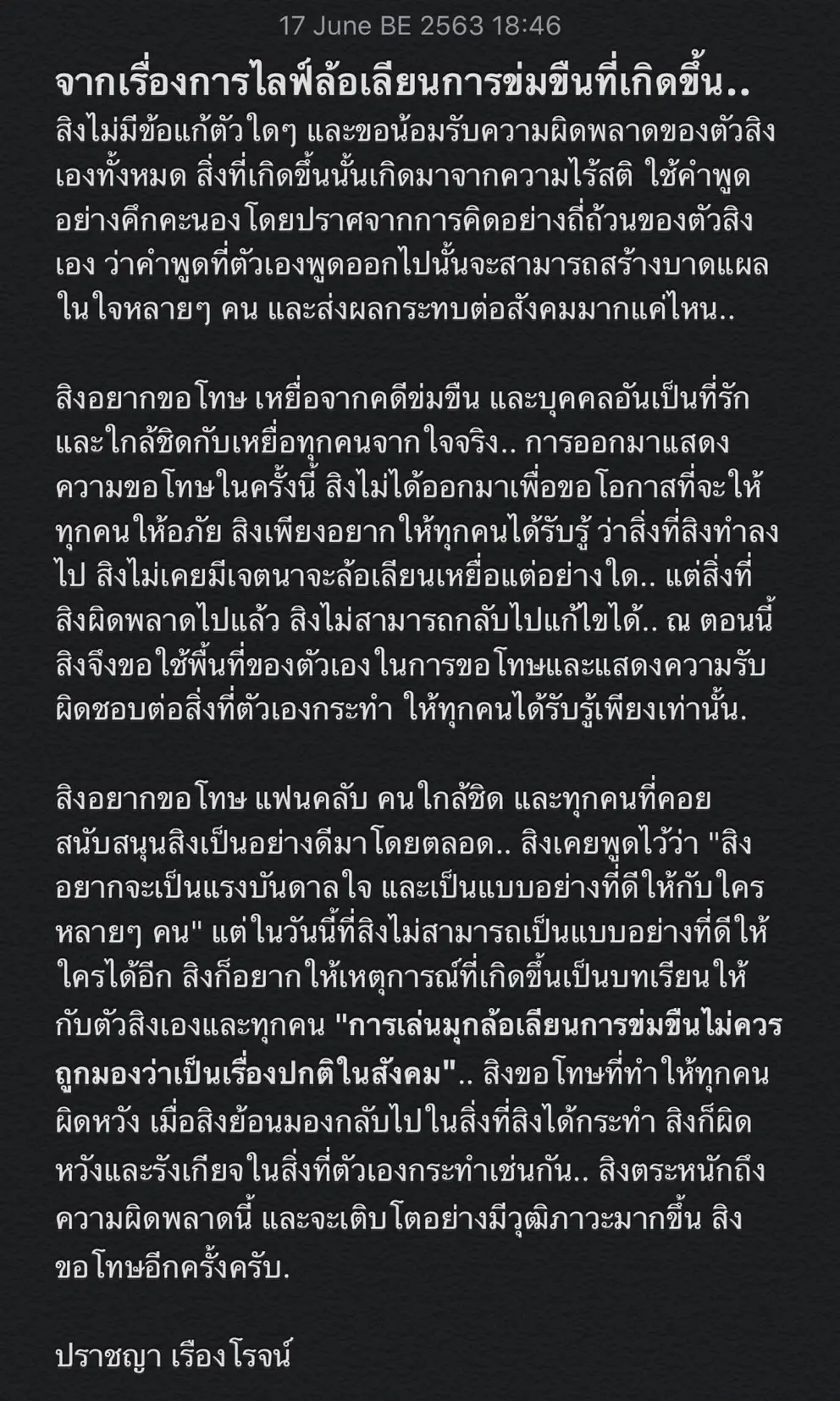 “จากเรื่องการไลฟ์ล้อเลียนการข่มขืนที่เกิดขึ้้น สิงไม่มีข้อแก้ตัวใด และขอน้อมรับความผิดพลาดของตัวเองทั้งหมด สิ่งที่เกิดขึ้นมาจากความไรสติ ใช้คำพูดอย่างคึกคะนองโดยปราศจากการคิดอย่างถี่ถ้วนของตัวสิงเอง ว่าคำพูดที่ตัวเองพูดออกไปนั้นจะสามารถสร้างบาดแผลในใจหลายๆคน และส่งผลกระทบต่อสังคมมากแค่ไหน