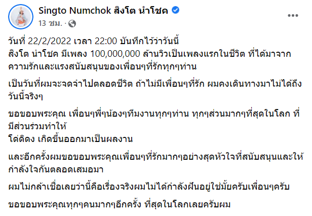 ล่าสุด (22 ก.พ.65) เพลง I JUST WANNA PEN FAN YOU DAI BOR ? ของ สิงโต นำโชค ทะลุเกิน 100 ล้านวิวเป็นทีเรียบร้อยแล้ว โดยเจ้าตัวเขียนบันทึกความทรงจำว่า “วันที่ 22/2/2022 เวลา 22:00 บันทึกไว้ว่าวันนี้ สิงโต นำโชค มีเพลง 100,000,000 ล้านวิวเป็นเพลงแรกในชีวิต ที่ได้มาจากความรักและแรงสนับสนุนของเพื่อนๆที่รักทุกๆท่าน เป็นวันที่ผมจะจดจำไปตลอดชีวิต ถ้าไม่มีเพื่อนๆที่รัก ผมคงเดินทางมาไม่ได้ถึงวันนี้จริงๆขอขอบพระคุณ เพื่อนๆพี่ๆน้องๆทีมงานทุกๆท่าน ทุกๆส่วนมากๆที่สุดในโลก ที่มีส่วนร่วมทำให้ โด่ดิดง เกิดขึ้นออกมาเป็นผลงาน และอีกครั้งผมขอขอบพระคุณเพื่อนๆที่รักมากๆอย่างสุดหัวใจที่สนับสนุนและให้กำลังใจกันตลอดเสมอมา ผมไม่กล้าเชื่อเลยว่านี้คือเรื่องจริงผมไม่ได้กำลังฝันอยู่ใช่มั้ยครับเพื่อนๆครับขอขอบพระคุณทุกๆคนมากๆอีกครั้ง ที่สุดในโลกเลยครับผม”