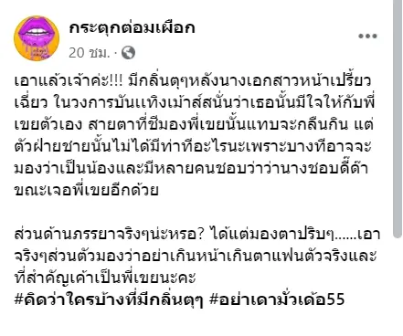 กลายเป็นประเด็นดังทั่วโซเชียลเมื่อเพจดังอย่างเพจ “กระตุกต่อมเผือก” เผยปริศนา นางเอกหน้าเฉี่ยว แอบมีใจให้พี่เขยตัวเอง โดยโพสต์ร่ายยาวว่า “เอาแล้วเจ้าค่ะ!!! มีกลิ่นตุๆหลังนางเอกสาวหน้าเปรี้ยวเฉี่ยว ในวงการบันเเทิงเม้าส์สนั่นว่าเธอนั้นมีใจให้กับพี่เขยตัวเอง สายตาที่ชีมองพี่เขยนั้นแทบจะกลืนกิน แต่ตัวฝ่ายชายนั้นไม่ได้มีท่าทีอะไรนะเพราะบางทีอาจจะมองว่าเป็นน้องและมีหลายคนชอบว่าว่านางชอบดี๊ด๊าขณะเจอพี่เขยอีกด้วย