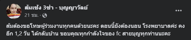 ‘ส้มต้องขอโทษผู้ร่วมงานทุกคนด้วยนะคะ ตอนนี้ยังต้องนอนโรงพยาบาลค่ะ คงอีก 1-2 วัน ได้กลับบ้าน ขอบคุณทุกกำลังใจของ FC สายบุญทุกท่านนะคะ’