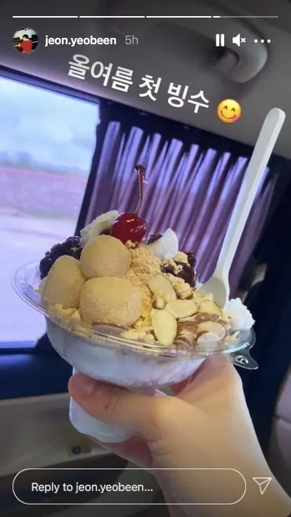 นอกจากนี้ จอนยอบินยังได้แบ่งปันรูปถ่ายกาแฟของเธอจากรถบรรทุกอย่างมีความสุข พร้อมกับสติกเกอร์ที่มีรูปถ่ายของและบิงซูที่ดูน่าอร่อยมากๆของเธอ โดยเธอเสริมในคำบรรยายว่า “บิงซูแรกของฉันในฤดูร้อนนี้”