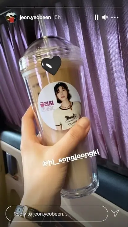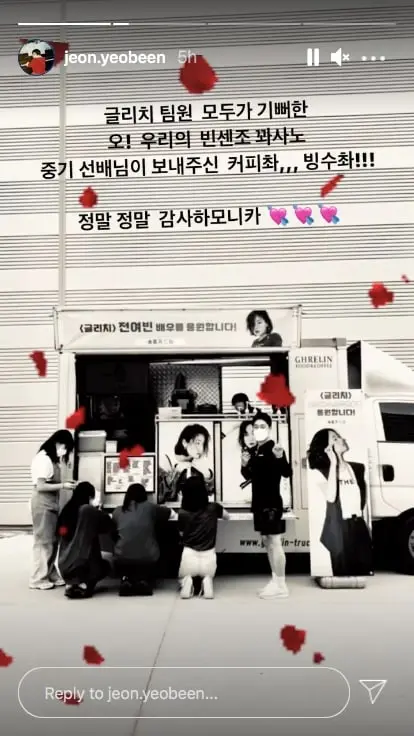 และในโพสต์ของนักแสดงสาว รถกาแฟที่ส่งโดยจุงกิ มีแบนเนอร์ที่เขียนข้อความเอาไว้ว่า “ให้กำลังใจนักแสดง ‘Glitch’ จอนยอบิน! จาก ซงจุงกิ’