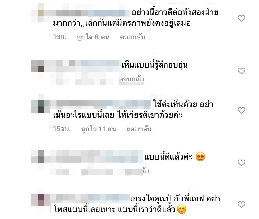 โดยก็มีแฟนคลับบางส่วนเข้าคอมเมนต์ต่อว่า เห็นด้วย และก็มีแฟนคลับที่เสียงแตก บอกว่าแบบนี้อาจจะดีต่อทั้ง2ฝ่ายมากกว่า เลิกกันแล้วแต่มิตรภาพยังอยู่ พร้อมกับบอกว่าอยากให้เกรงใจคุณพ่อและทุกคนๆ พร้อมทั้งขอว่าอย่าโพสต์แบบนี้อีกดีกว่า