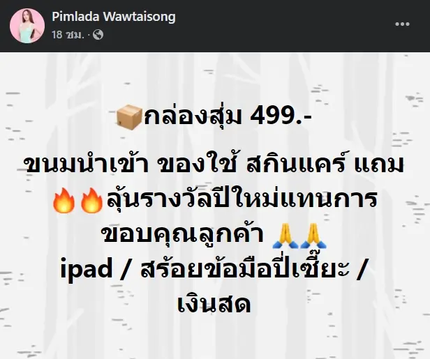 เรียกได้ว่าช่วงสิ้นปีนี้ กระแสกล่องสุ่มนั้นมาแรงสุดๆ ล่าสุด สอดอ Style ยูทูบเบอร์สาวชื่อดัง ก็ไม่พลาดที่จะจัดของส่งท้ายปี ตอบแทนลูกค้าแบบจุกๆด้วยเช่นกัน โดยเธอได้มีการโพสต์ข้อความผ่านทางเฟซบุ๊กว่า