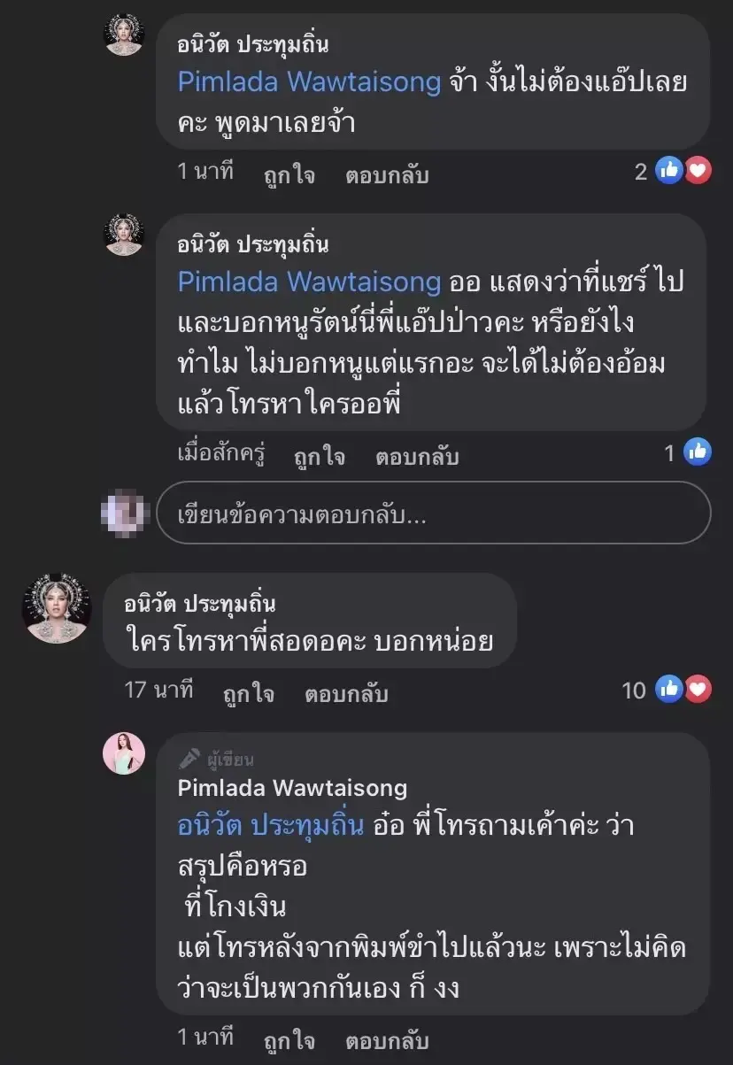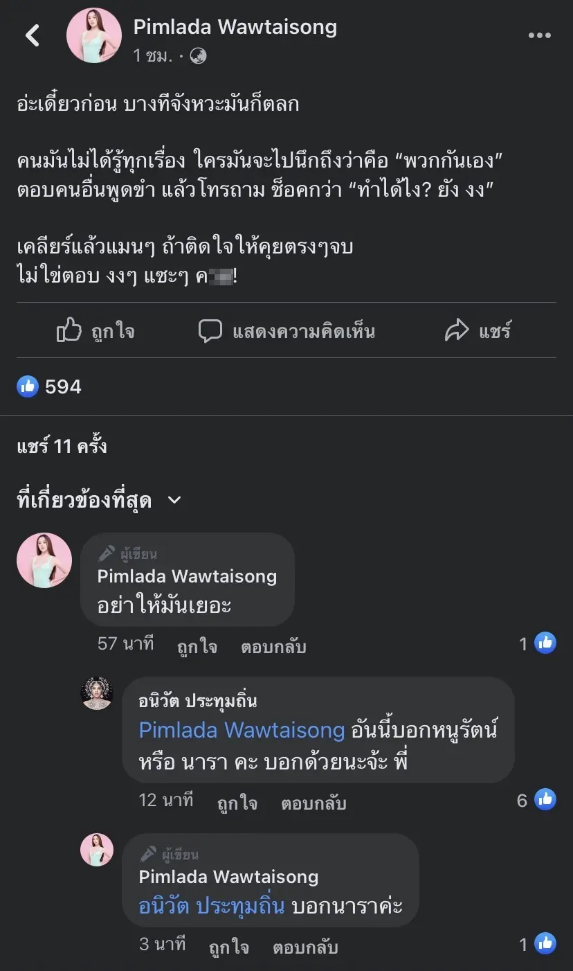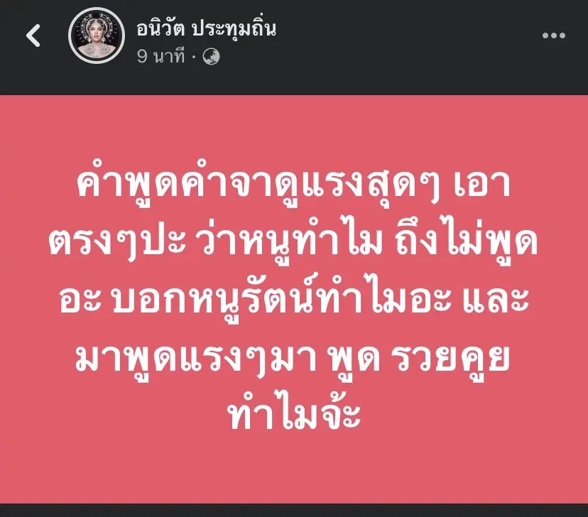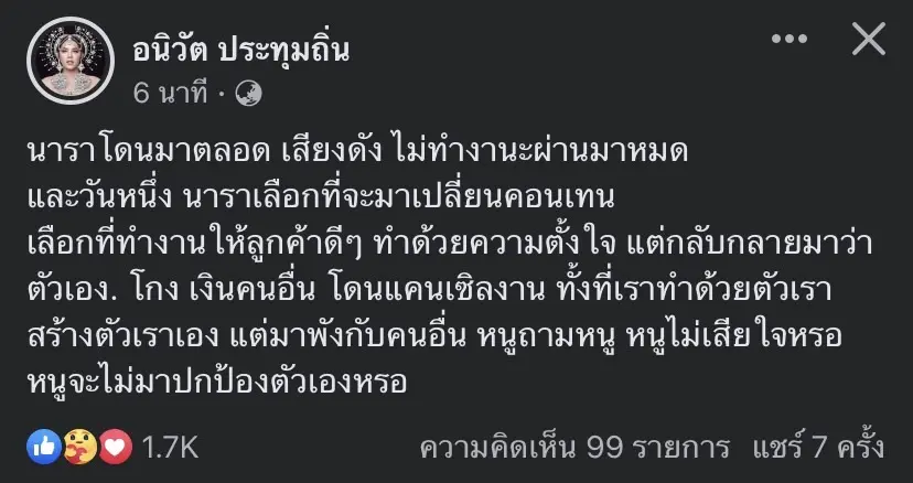 ซึ่งด้านเฟซบุ๊ก อนิวัต ประทุมถิ่น ของนารา ก็ได้มีการโพสต์ข้อความด้วยเช่นกันว่า คำพูดคำจาดูแรงสุดๆ เอาตรงๆป้ะ ว่าหนูทำไม ถึงไม่พูดอะ บอกหนูรัตน์ทำไมอะ และมาพูดแรงๆ มาพูดรวยคูยทำไมจ้ะ , นารา โดนมาตลอด เสียงดัง ไม่ทำงาน ผ่านมาหมดและวันหนึ่ง นาราเลือกที่จะมาเปลี่ยนคอนเทนต์ เลือกที่ทำงานให้ลูกค้าดีๆ ทำด้วยความตั้งใจ แต่กลับกลายมาว่า ตัวเองโกงเงินคนอื่น โดนแคนเซิลงาน ทั้งที่เราทำด้วยตัวเรา สร้างตัวเราเอง แต่มาพังกับคนอื่น หนูถามหนู หนูไม่เสียใจหรอ หนูจะไม่มาปกป้องตัวเองหรอ