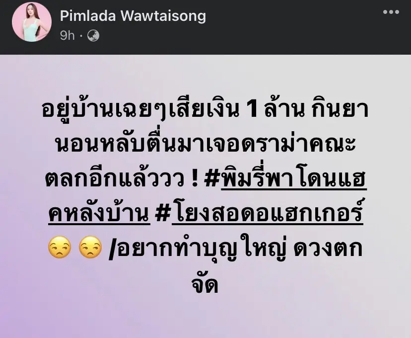 ล่าสุด สอดอ Style ได้มีการโพสต์ข้อความผ่านทางเฟซบุ๊ก Pimlada Wawtaisong ว่า อยู่บ้านเฉยๆเสียเงิน 1 ล้าน กินยานอนหลับตื่นมาเจอดราม่า คณะตลกอีกแล้ววว ! #พิมรี่พายโดนแฮกหลังบ้าน #โยงสอดอแฮกเกอร์ / อยากทำบุญใหญ่ ดวงตกจัด