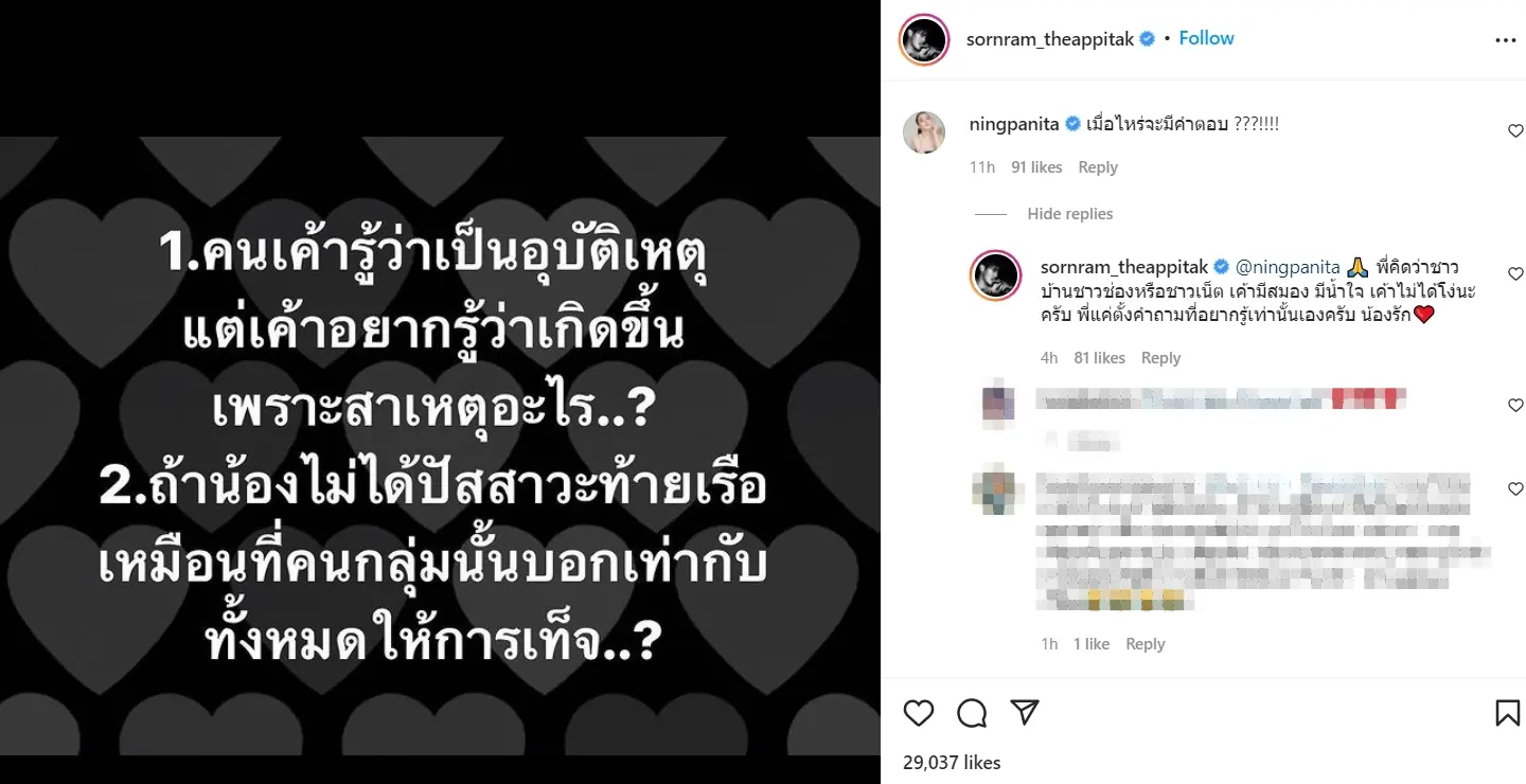 ขณะเดียวกันด้าน หนิง ปณิตา ก็ได้เข้ามาคอมเมนต์ในโพสต์ดังกล่าวอย่างทันทีว่า เมื่อไหร่จะมีคำตอบ ???!!!! ทำเอาด้านหนุ่ม ศรราม ถึงกับเข้าไปตอบคอมเมนต์ดังกล่าวอย่างทันทีว่า พี่คิดว่าชาวบ้านชาวช่องหรือชาวเน็ต เค้ามีสมอง มีน้ำใจ เค้าไม่ได้โง่นะครับ พี่แค่ตั้งคำถามที่อยากรู้เท่านั้นเองครับ น้องรัก