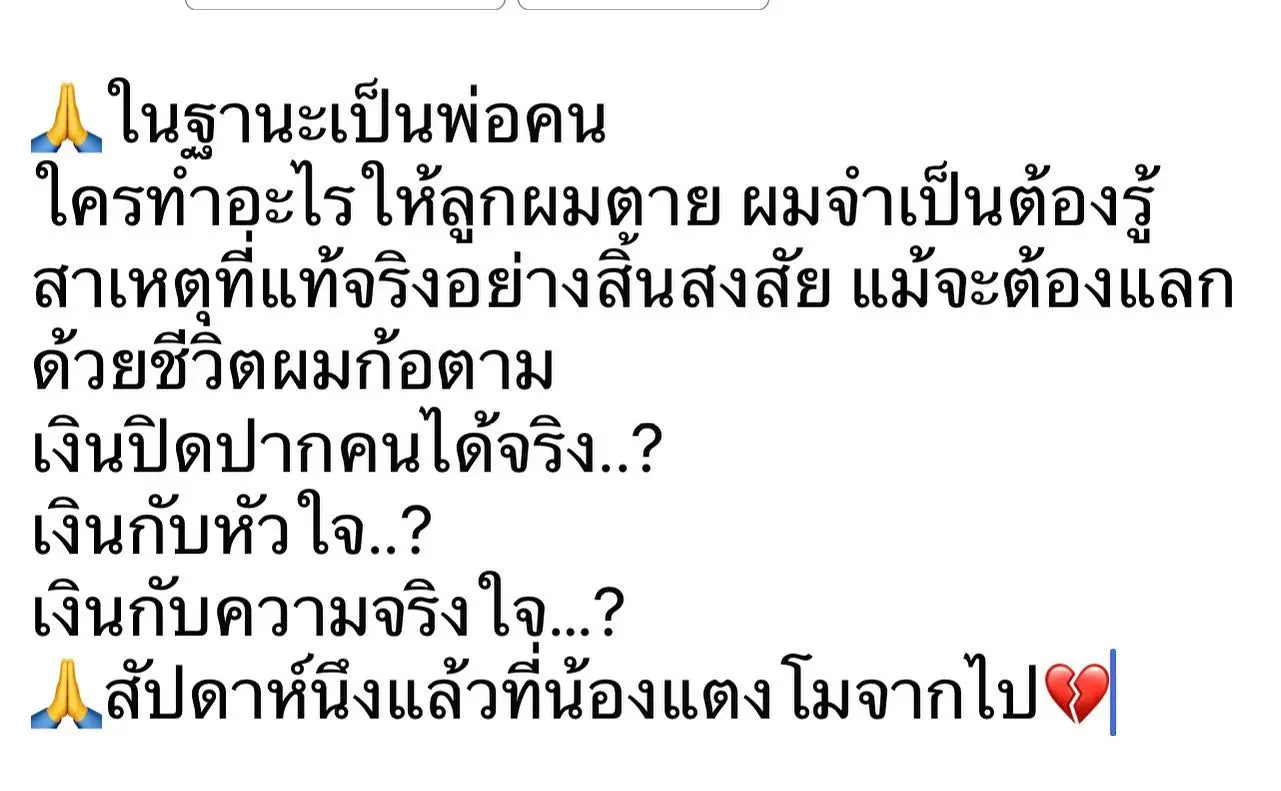 ล่าสุด หนุ่ม ศรราม ได้ออกมาโพสต์ข้อความผ่านอินสตราแกรมเรียกร้องความเป็นธรรมให้กับแตงโมว่า ในฐานะเป็นพ่อคน ใครทำอะไรให้ลูกผมตาย ผมจำเป็นต้องรู้ สาเหตุที่แท้จริงอย่างสิ้นสงสัย แม้จะต้องแลก ด้วยชีวิตผมก้อตาม เงินปิดปากคนได้จริง..? เงินกับหัวใจ..? เงินกับความจริงใจ สัปดาห์นึงแล้วที่น้องแตงโมจากไป