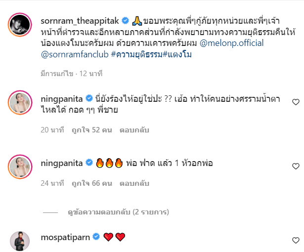 นอกจากนี้ยังโพสต์แคปชั่นว่า 🙏ขอบพระคุณพี่ๆกู้ภัยทุกหน่วยและพี่ๆเจ้าหน้าที่ตำรวจและอีกหลายภาคส่วนที่กำลังพยายามทวงความยุติธรรมคืนให้น้องแตงโมนะครับผม ด้วยความเคารพครับผม @melonp.official @sornramfanclub #ความยุติธรรม#แตงโม