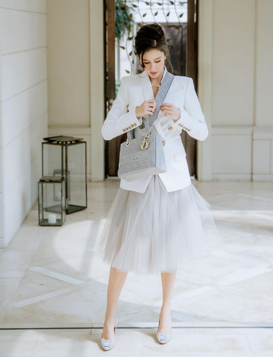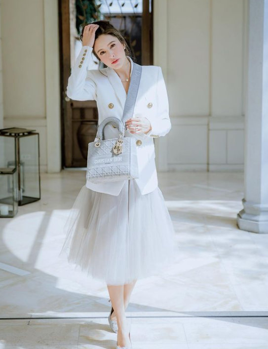 ล่าสุด สาวศรีริต้าก็มาโพสต์รูปเซ็ตใหม่ โดยคราวนี้มาในชุดสูท และกระโปรงสีขาวเข้าชุดกัน พร้อมกับสะพายกระเป๋าดิออร์สุดเข้ากัน