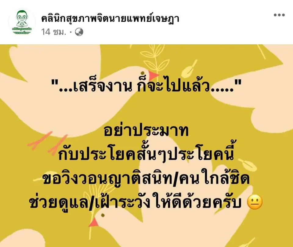 ต่อมามีเพจคลินิกสุขภาพจิตออกมาเผยว่า อย่าประมาทกับประโยคสั้นๆ ประโยคนี้ ขอวิงวอนญาติสนิท คนใกล้ชิด ช่วยดูแล เฝ้าระวังให้ดีด้วย หลังคำพูดของเบิร์ด ที่บอกกับเพื่อนๆ แตงโม ภายในงานพิธีไว้อาลัยว่า …เสร็จงาน ก็จะไปแล้ว…