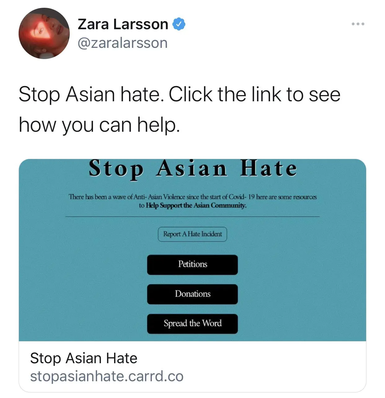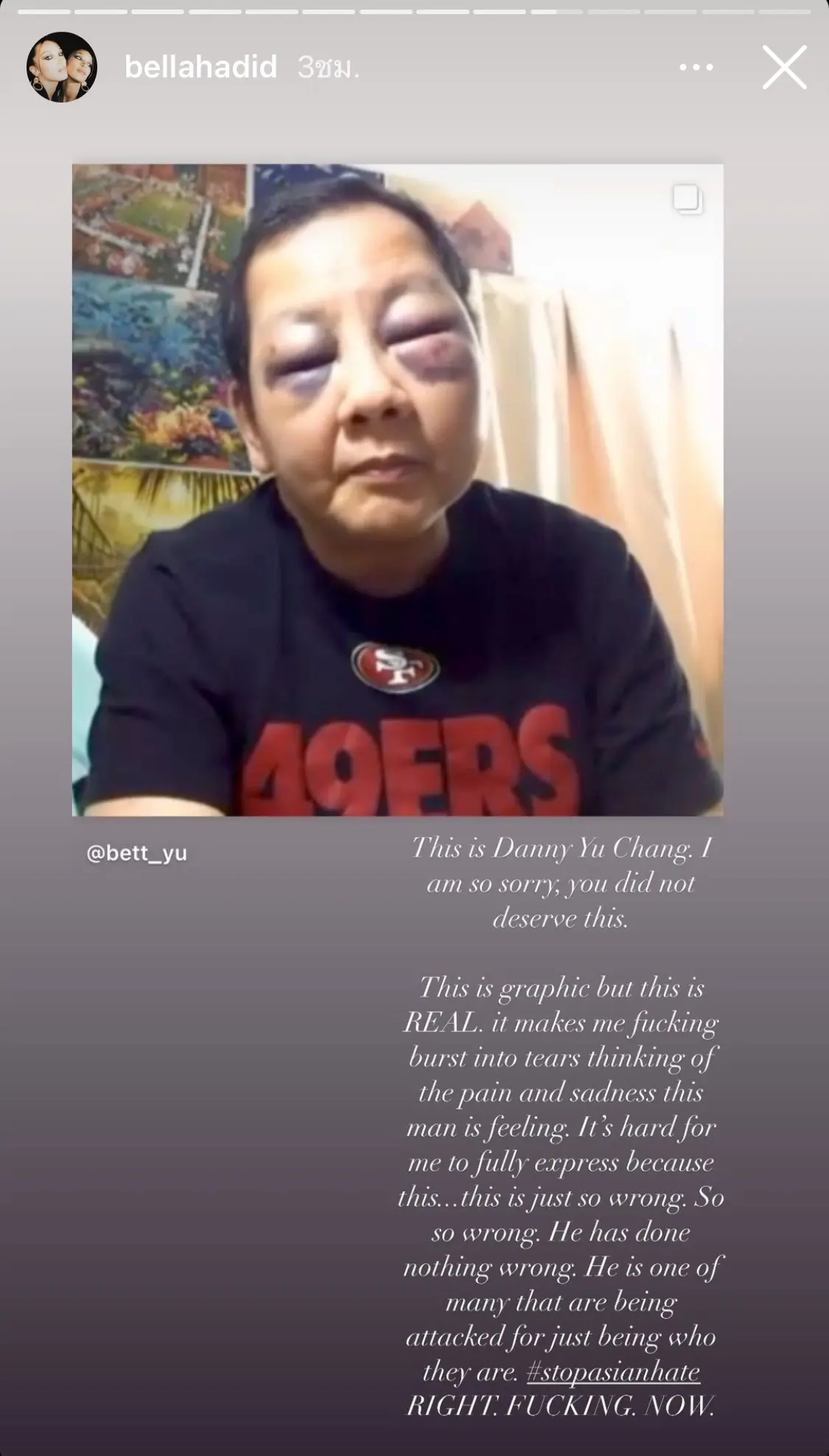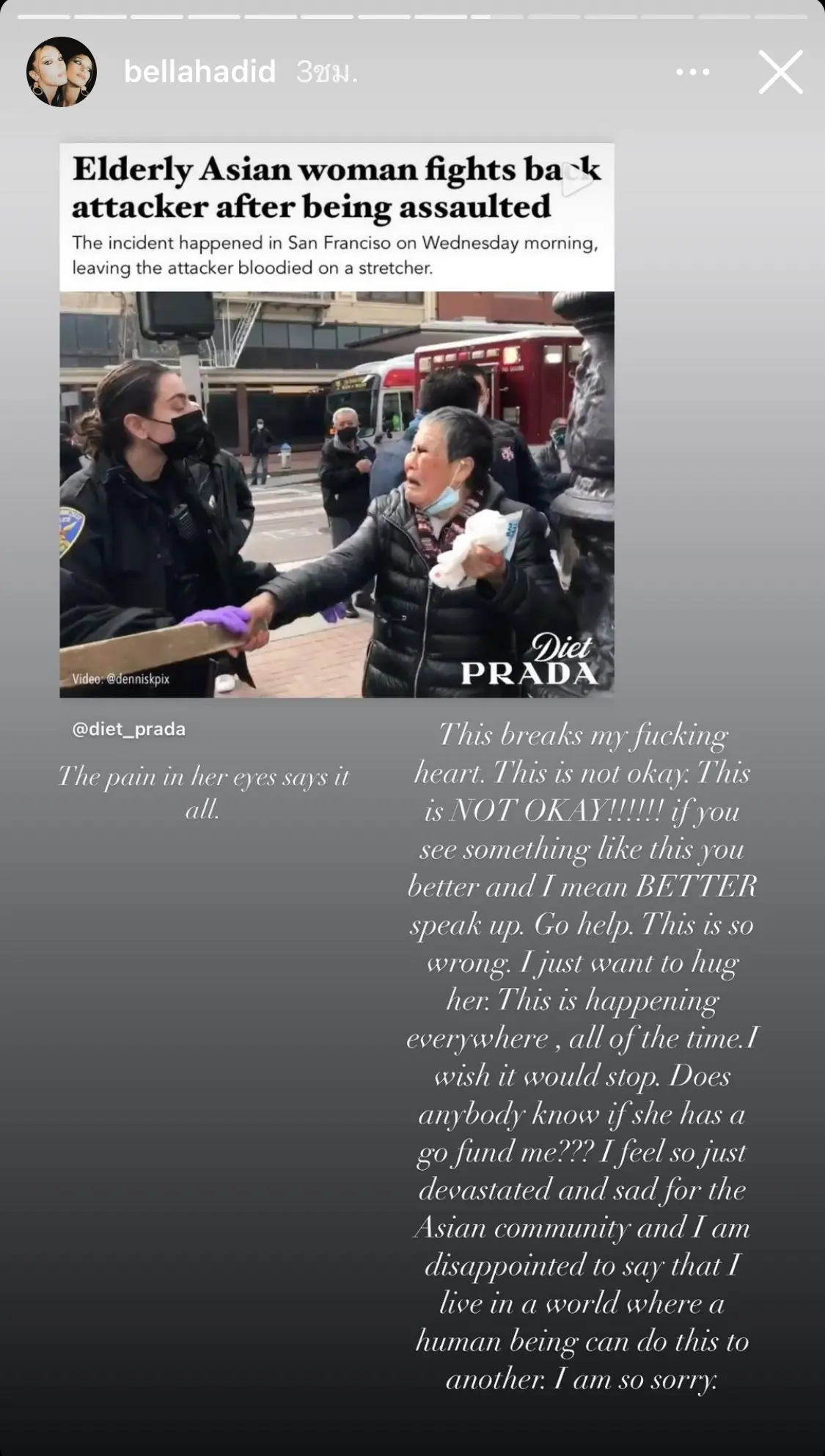 ” นี่ทำให้หัวใจของฉันสลาย มันไม่โอเคเลย ถ้าคุณเห็นอะไรแบบนี้คุณต้องออกมาพูดจริง ๆ นะ ไปช่วยเลย นี่มันแย่มาก ฉันอยากให้มันหยุด ฉันเสียใจและเศร้ากับ Asian community จริง ๆ #StopAsianHate ” – Bella Hadid นางแบบชื่อดังชาวอเมริกัน กล่าว