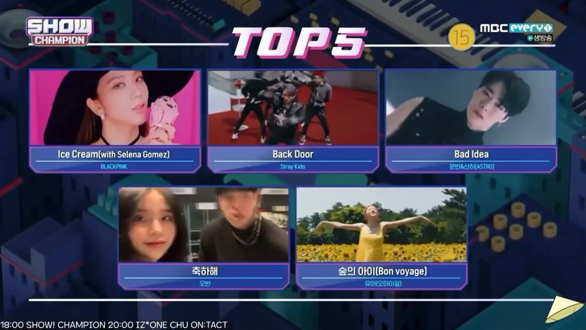 หลังจากที่เพิ่งคว้าอันดับ 1 ศิลปินหน้าใหม่มาแรงในทวิตเตอร์มาหมาดๆ ในวันนี้ (23 ก.ย. 63) หนุ่มๆ Stray Kids ได้โชว์การแสดงกับเพลง Back Door เพลงไตเติลจากอัลบัม IN LIFE พร้อมกับเพลง Ex ที่มาจากอัลบัมเดียวกัน ในราย Show Champion โดยในช่วงท้ายของรายการได้มีการประกาศเพลงที่จะชนะในวันนี้ ซึ่งมีผู้เข้าชิงคือ เพลง Ice Cream จาก BLACKPINK , Back Door จาก Stray Kids , เพลง Bad Idea จากดูโอ้ Moonbin & Sanha (วง ASTRO) , เพลง Happy Birthday จาก OVAN และเพลง Bon Voyage จาก YooA (วง Oh My Girl) และ Stray Kids ก็ชนะอันดับ 1 คว้าถ้วยรางวัลจากรายการมาได้!