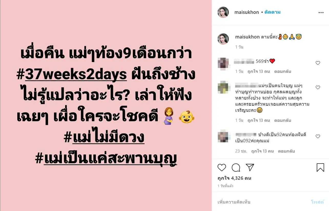 ล่าสุดเมื่อวันที่ 12 พ.ย. 63 ที่ผ่านมา คุณแม่คนสวย ก็ได้อัพรูปที่มีข้อความว่า “เมื่อคืน แม่ๆท้อง 9 เดือนกว่า #37weeks2days ฝันถึงช้างไม่รู้แปลว่าอะไ? เล่าให้ฟังเฉยๆ เผื่อใครจะโชคดี #แม่ไม่มีดวง #แม่เป็นแค่สะพานบุญ”