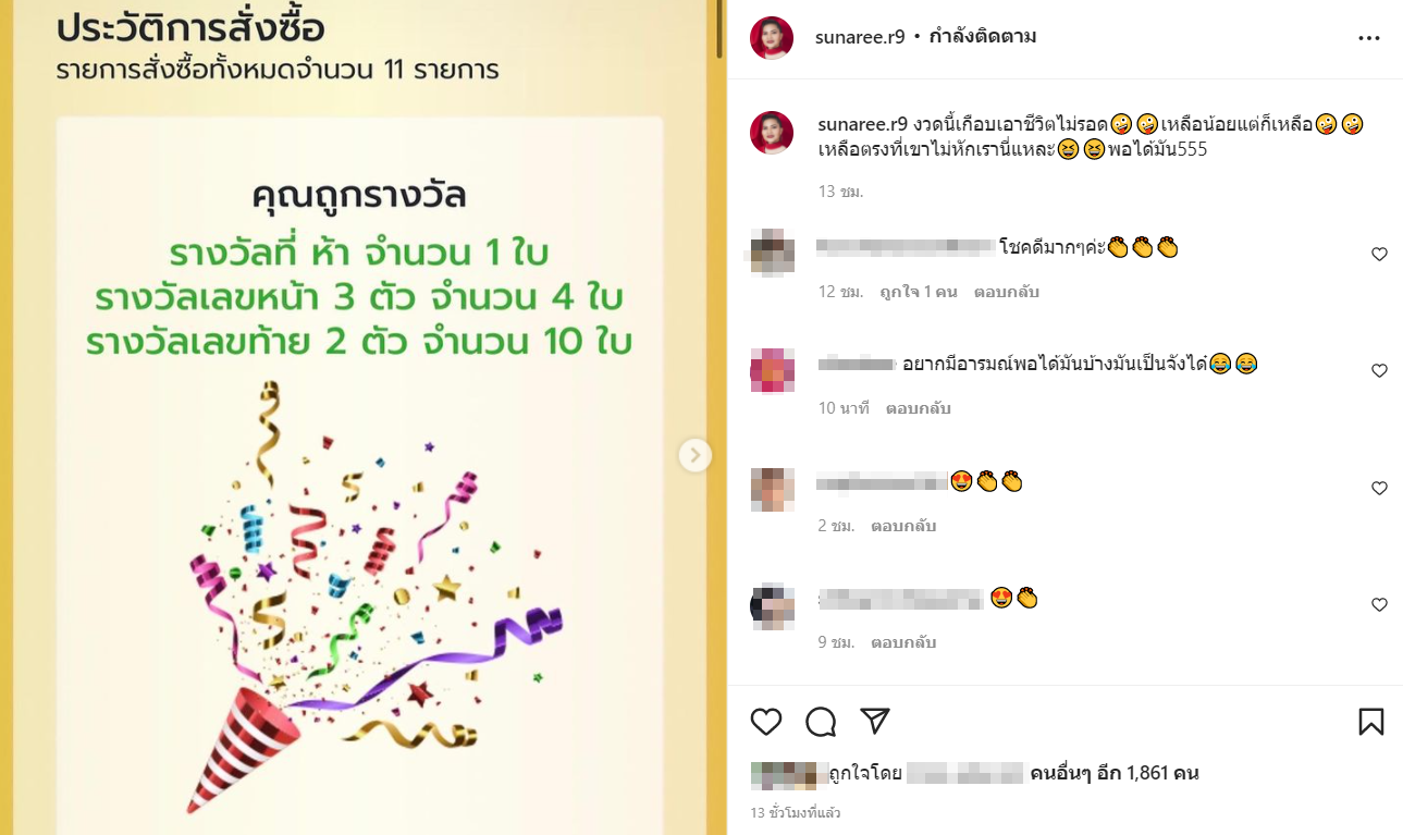 โดยเธอได้โพสต์ ถูกรางวัลที่ 5 จำนวน 1 ใบ รางวัลเลขหน้า 3 ตัวจำนวน 4 ใบ และ รางวัลเลขท้าย 2 ตัวจำนวน 10 ใบ พร้อมแคปชั่นว่า งวดนี้เกือบเอาชีวิตไม่รอด🤪🤪เหลือน้อยแต่ก็เหลือ🤪🤪 เหลือตรงที่เขาไม่หักเรานี่แหละ😆😆พอได้มัน555 ท่ามกลางแฟนเพลงที่เข้ามาแสดงความยินดี พร้อมบอกว่าโชคดีจัง